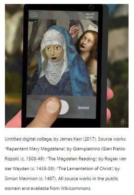 Hagiography Beyond Tradition series image, digital collage by James Kerr. Mary Magdalene photobombs the Virgin Mary taking a selfie on a smartphone.